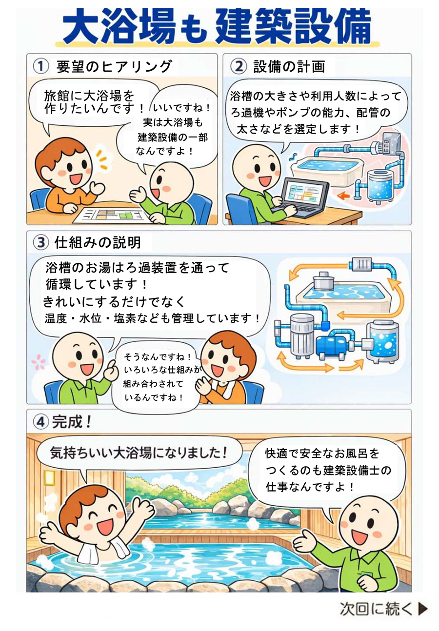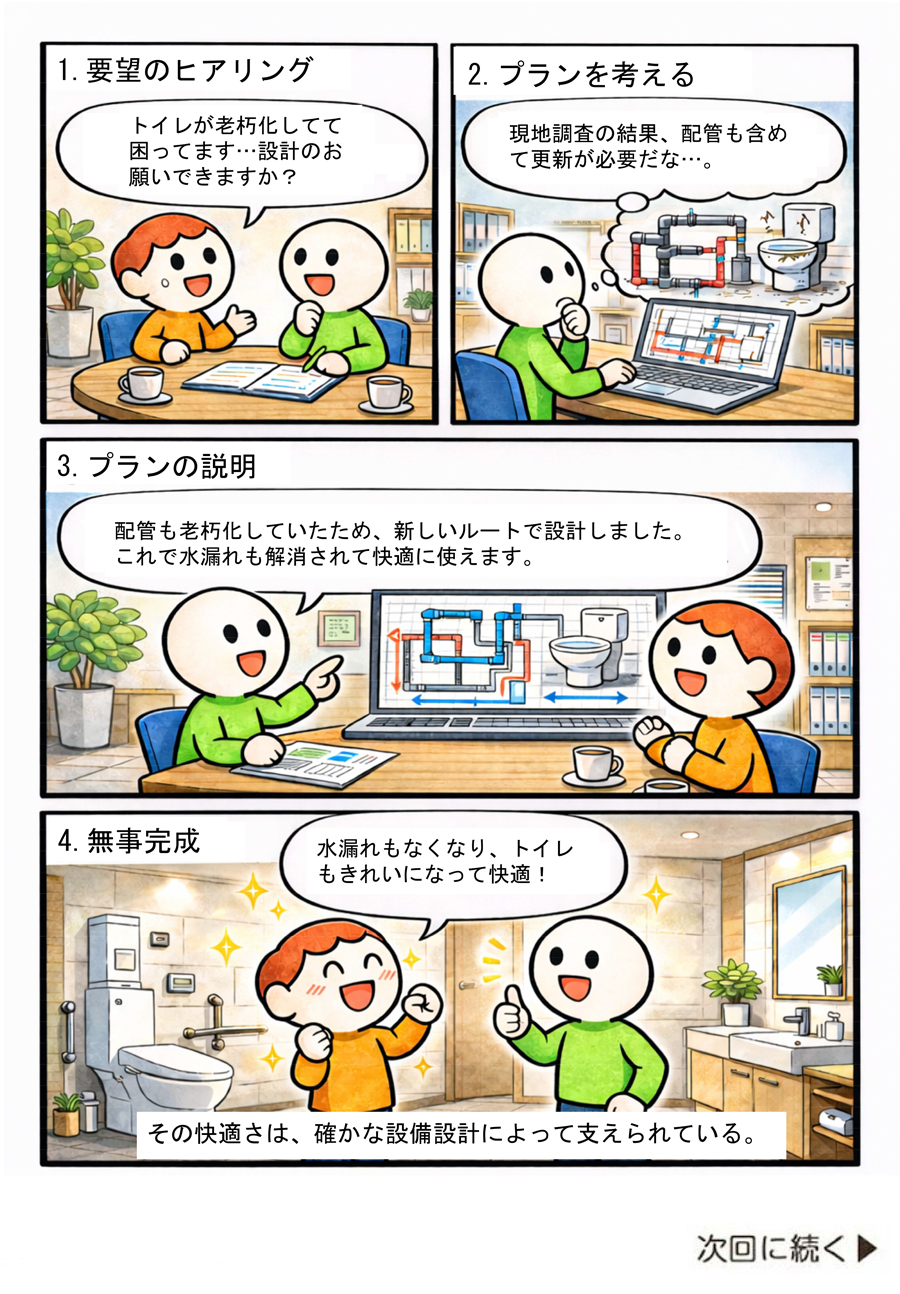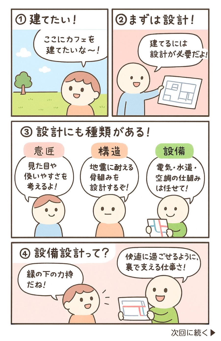 「設備設計」は、建物の電気・水・空調・防災などを快適で安全に使えるように計画する仕事です。